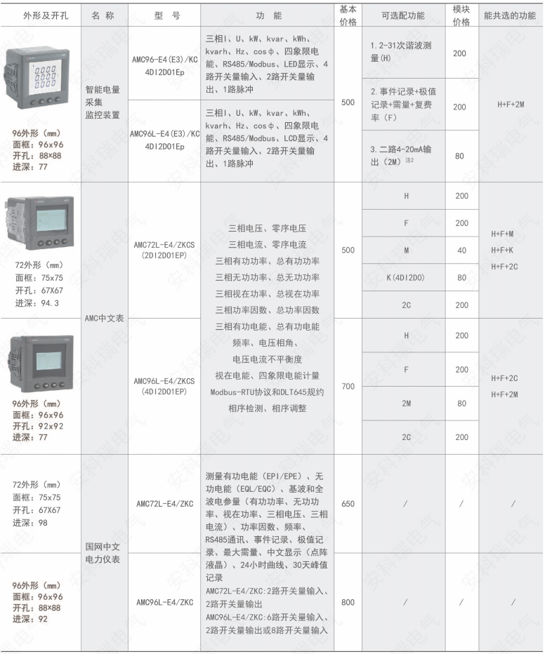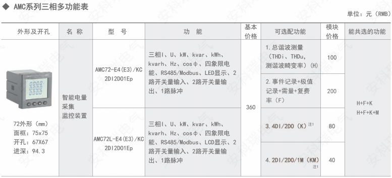 AMC 系列智能電量采集監(jiān)控裝置,是針對(duì)電力系統(tǒng)、工礦企業(yè)、公用設(shè)施、智能大廈的電力監(jiān)控需求而設(shè)計(jì)的智能儀表,它集成電力參數(shù)的測(cè)量(如單相或者三相的電流、電壓、有功功率、無功功率、視在功率、頻率、功率因數(shù))以及電能監(jiān)測(cè)和考核管理。同時(shí)它具有多種外圍接口功能可供用戶選擇∶帶有RS485通訊接口,采用MODDS-RTU協(xié)議可滿足通訊聯(lián)網(wǎng)管理的需要;4-20mA的模擬量輸出可與測(cè)量的電參量相對(duì)應(yīng),滿足DCS等接口要求;帶開關(guān)量輸入和繼電器輸出可實(shí)現(xiàn)斷路器開關(guān)的“遙信”和“遙控”的功能。采用高亮度LED/LCD顯示界面,通過按鍵來實(shí)現(xiàn)參數(shù)設(shè)置和控制,非常適用于實(shí)時(shí)電力監(jiān)控系統(tǒng)。可以直接取代常規(guī)電力變送器及測(cè)量儀表。作為一種智能化、數(shù)字化的前端采集元件,該儀表已廣泛應(yīng)用于各種控制系統(tǒng)、SCADA系統(tǒng)和能源管理系統(tǒng)中。