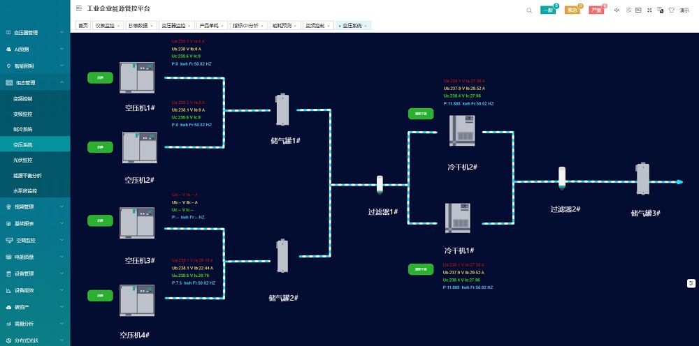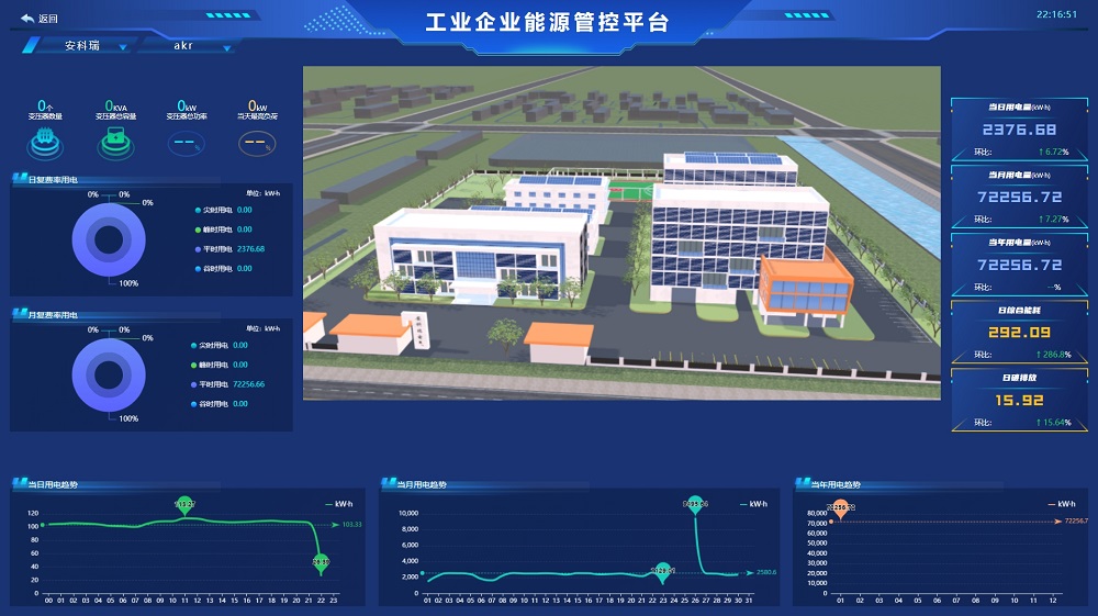 展示企業(yè)各類能耗總量、折標值、能源成本、能源消耗趨勢、分項能耗占比、區(qū)域能源消耗對比,以及當前天氣情況、污染情況,并三維展示企業(yè)重要工藝或工段的能源消耗動態(tài)。