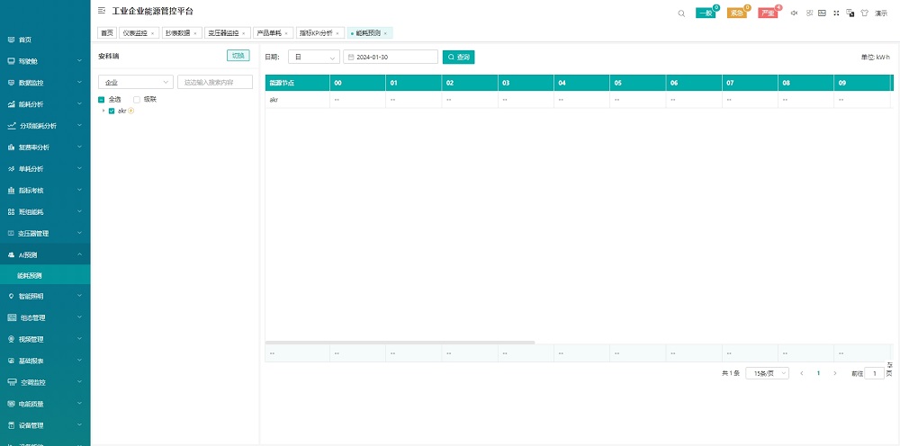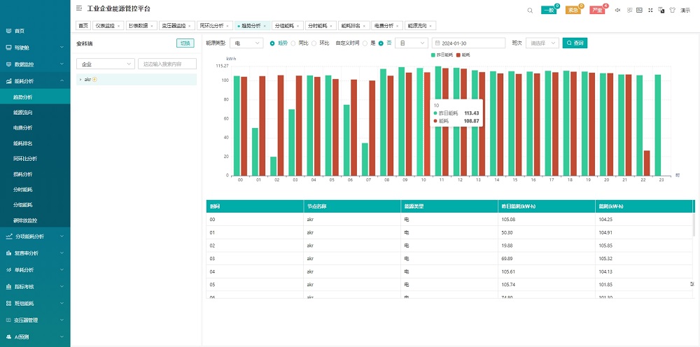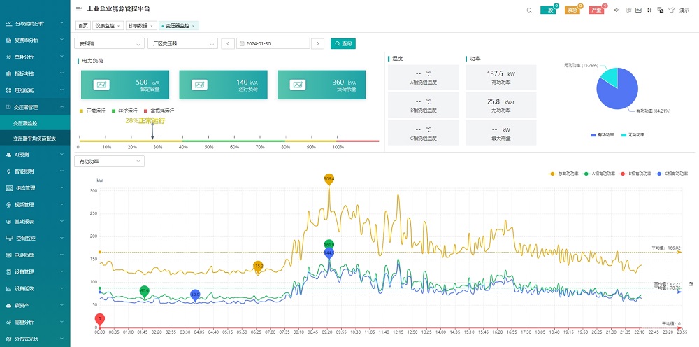 從能源使用種類、監(jiān)測區(qū)域、生產(chǎn)工藝/工段時間、分項等維度,采用曲線、餅圖、直方圖、累積圖、數(shù)字表等方式對企業(yè)用能統(tǒng)計、同比、環(huán)比分析、實績分析,折標對比、單位產(chǎn)品能耗、單位產(chǎn)值能耗統(tǒng)計,找出能源使用過程中的漏洞和不合理地方,從而調(diào)整能源分配策略,減少能源使用過程中的浪費。