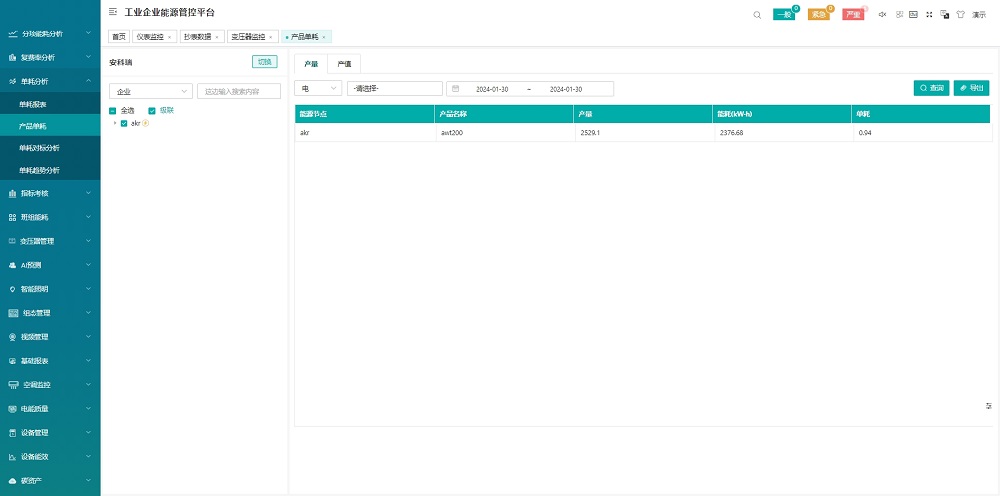 與企業(yè)MES系統(tǒng)對接,通過產(chǎn)品產(chǎn)量以及系統(tǒng)采集的能耗數(shù)據(jù),在產(chǎn)品單耗中生成產(chǎn)品單耗趨勢圖,并進行同比和環(huán)比分析。以便企業(yè)能夠根據(jù)產(chǎn)品單耗情況來調(diào)整生產(chǎn)工藝,從而降低能耗。