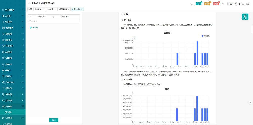 以年、月、日對企業(yè)的能源利用情況、線路損耗情況、設(shè)備運行情況、運維情況等進行統(tǒng)計分析,讓用戶了解系統(tǒng)的運行情況,并為用戶提供數(shù)據(jù)基礎(chǔ),方便用戶發(fā)現(xiàn)設(shè)備異常,從而找出改善點,以及針對用能情況挖掘節(jié)能潛力。