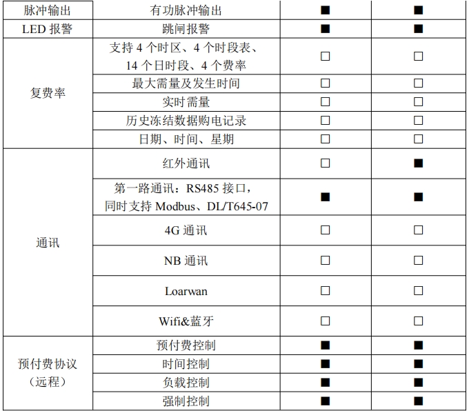 儀表支持預(yù)付費(fèi)功能??稍O(shè)置基礎(chǔ)金額,供電表免費(fèi)試用;可對(duì)剩余金額進(jìn)行四級(jí)報(bào)警: 余額不足報(bào)警(一級(jí))、預(yù)跳閘報(bào)警(二級(jí))、欠費(fèi)報(bào)警(三級(jí))、達(dá)到賒欠上限(四級(jí)) 報(bào)警。每級(jí)報(bào)警都會(huì)導(dǎo)致電表背光常亮,預(yù)跳閘報(bào)警跳閘方式可設(shè)置為不跳閘、跳閘后自動(dòng) 合閘以及跳閘后不合閘等,跳閘后可通過按鍵自行合閘,達(dá)到賒欠上限后電表跳閘,此時(shí)只 有繳費(fèi)后才能繼續(xù)送電使用。