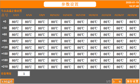 觸摸屏上電進(jìn)入工作狀態(tài)后,默認(rèn)即為“實(shí)時(shí)溫度”界面,再此界面可觀察到各節(jié)點(diǎn)采集的溫度值。