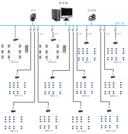 本項目共一個35KV/10KV變電站、9個0.4KV配電站、一個柴發(fā)配電站,變電站搭建一套電力監(jiān)控系統(tǒng),放置在35KV變電站值班室內(nèi),變電所內(nèi)部綜保、多功能儀表、溫控儀等設(shè)備通過485接口接入變電站內(nèi)部采集器,再通過采集器傳輸至電力監(jiān)控主機(jī),實現(xiàn)數(shù)據(jù)在電腦上可視化管理。