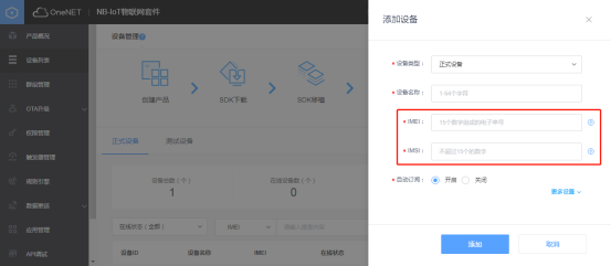 3. 添加設(shè)備,添加設(shè)備時(shí)所用到的IMEI和IMSI號(hào)可以在儀表端進(jìn)行獲取。