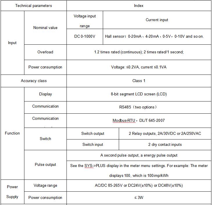 The meter can have infrared communication interface and RS-485 communication interface, and supports Modbus-RTU protocol and DLT645-97 (07) protocol at the same time.The meter can have relay alarm output and digital input function;You can set the ratio, alarm, and communication through the meter panel keys according to different requirements.The meter can have event recording of switch (Modbus protocol), programming and event setting records (645 protocol), instantaneous and timing freeze function of data (645 protocol), maximum and minimum value recording function of voltage and current power.