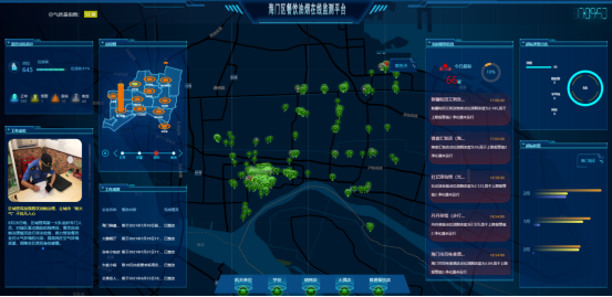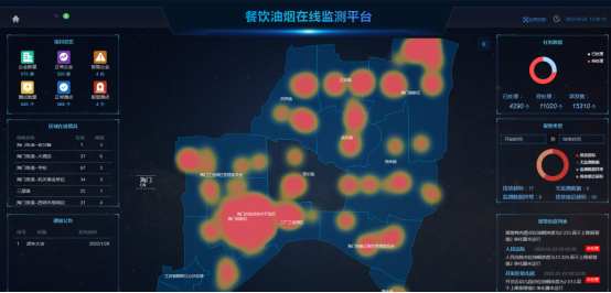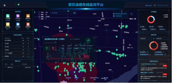 全屏展示界面UI可定制,顯示內容可根據需求調整;地圖點位可根據監(jiān)測狀態(tài)以不同顏色區(qū)分,根據區(qū)域內油煙濃度情況,劃分不同熱力區(qū)塊,凸顯主要區(qū)域,地圖可顯示省控點周邊1km和3km區(qū)域范圍。