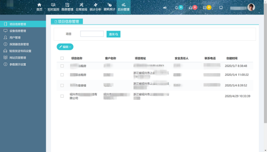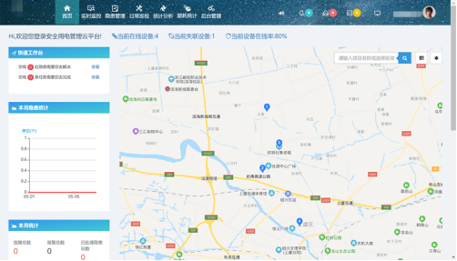 通過平臺首頁可以快速瀏覽隱患巡查界面或隱患處理界面、本月隱患、故障統(tǒng)計以及項(xiàng)目信息地圖導(dǎo)航,智能調(diào)度技術(shù)人員可以通過曲線、地圖等各種方式查看隱患數(shù)量、隱患位置、隱患發(fā)生頻率以及任務(wù)的接收、下發(fā)情況,并可以通過項(xiàng)目列表、地圖快速查定位需要查詢的項(xiàng)目情況。