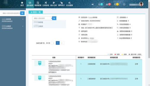 通過實(shí)時監(jiān)控界面,除了可以實(shí)時顯示項(xiàng)目所屬客戶、地址、建筑面積、消防設(shè)施、安全責(zé)任人、聯(lián)系電話、設(shè)備數(shù)量、探測器數(shù)量等信息,還以更醒目的方式顯示了未處理報警和未處理故障信息,下屬設(shè)備和探測器,并可以查看各設(shè)備以及探測器基本信息、開關(guān)操作、數(shù)據(jù)監(jiān)控、實(shí)時數(shù)據(jù)、參數(shù)設(shè)置、歷史信息和報警信息等。